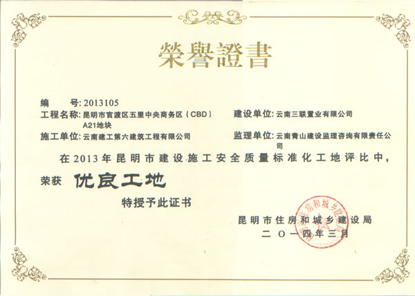 祝賀五里中央商務(wù)區(qū)項目獲得2013年昆明市標(biāo)準(zhǔn)工地優(yōu)良工地稱號